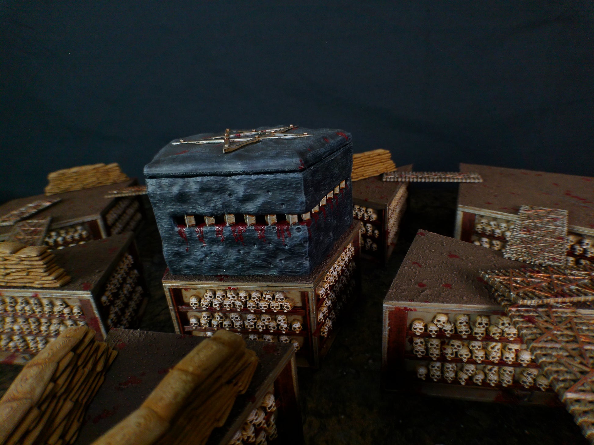 A pentagonal shaped ruined bunker riddled with battle damage and decorated with pentagrams. Top piece is removable to easily place miniatures inside.