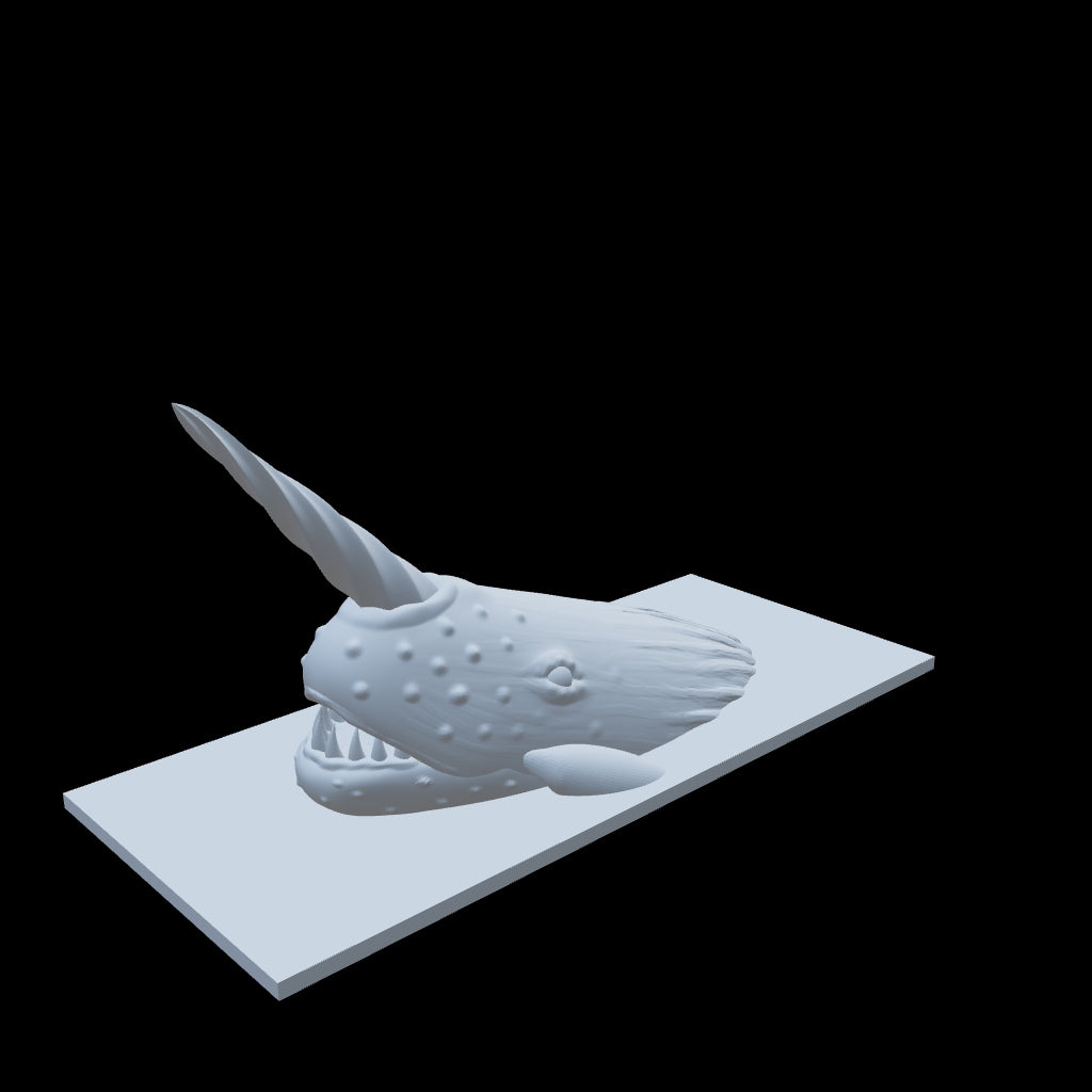 A narwhale miniature, covered in barnacles with a mighty spiral horn.