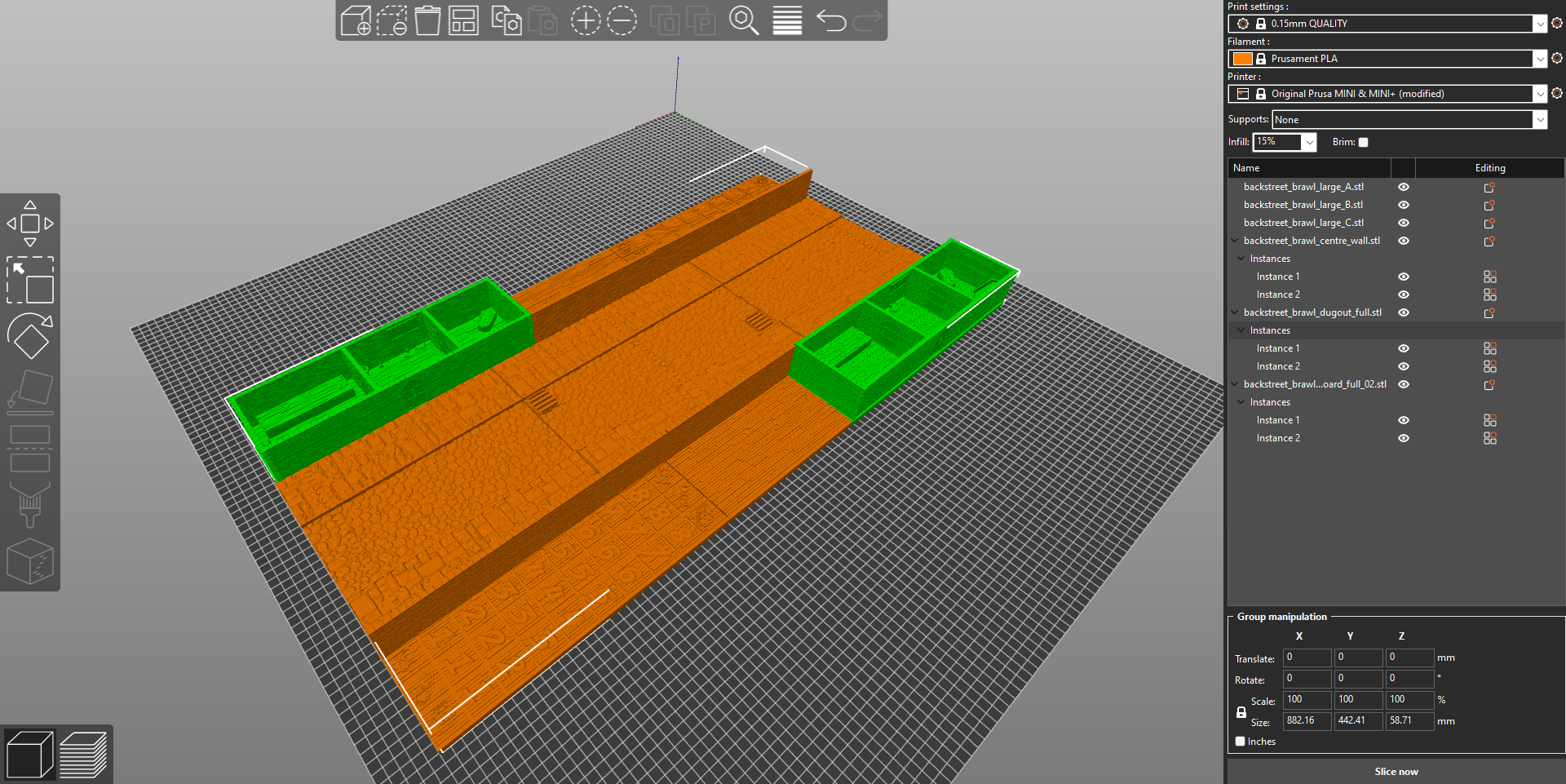 The street-themed pitch is formed of 6 different pieces which can be printed out on a minimum print bed size of 7" (Prusa Mini and larger). Large cuts are provided for XL printers and smaller cuts are provided for resin printers.